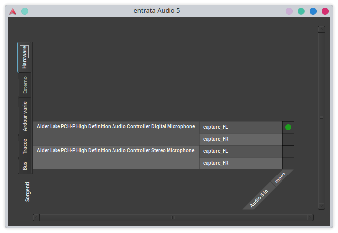 Le schede visualizzate verticalmente sulla sinistra sono le sorgenti disponibili. “Audio 5 in” in basso a destra è la destinazione. Il punto verde rappresenta una connessione.